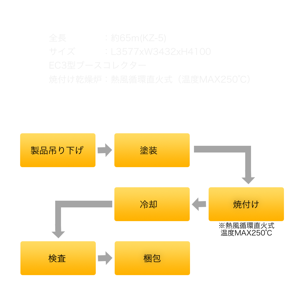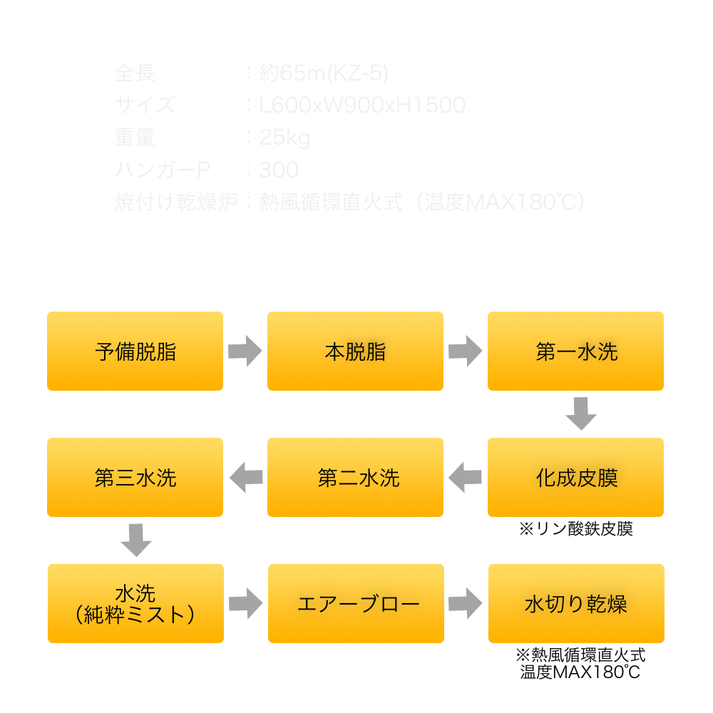 当社の設備はH18年に工場移転に伴い新設しています。前処理ライン設備はオールステンとなっており、前処理・第1,2溶剤・粉体と3つのラインを独立させることで、安定した生産性・品質管理を実現し、また小回りの聞く設備となっていおります。 立地条件も非常に交通の便がよく、流通面でのメリットも大きくなっております。